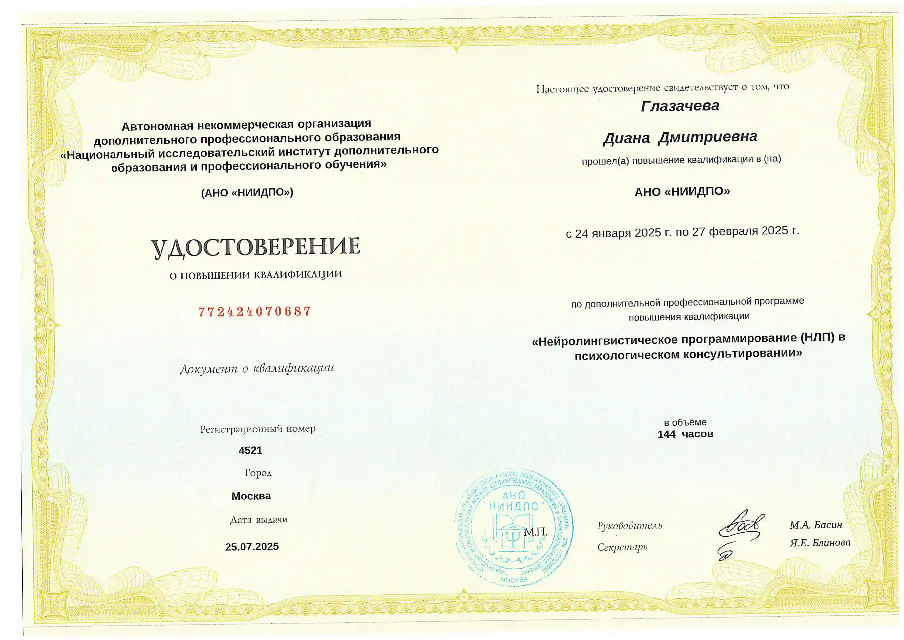 • 2025 — Повышение квалификации «НЛП в психологическом консультировании». Национальный исследовательский институт дополнительного образования (АНО «НИИДПО»), Москва.
